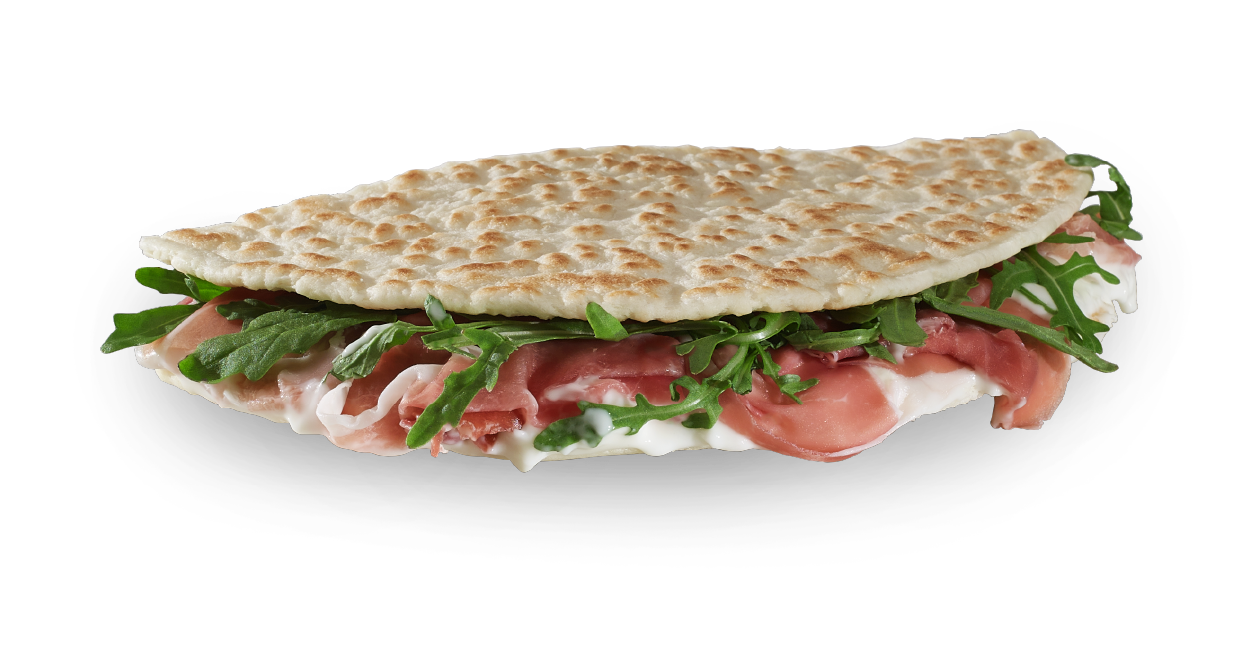 Piadina Romagnola IGP, da gustare con il classico abbinamento prosciutto crudo, squacquerone e rucola, o la più sostanziosa salsiccia e cipolla. Ottima anche al posto del pane, per accompagnare tutti i vostri piatti.